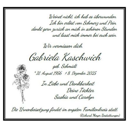 † 8. Dezember 2025, Gabriela Kaschwich, geb. Schmidt