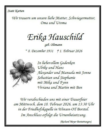 † 1. Februar 2026, Erika Hauschild, geb. Oltmann